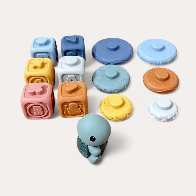 • Contient : (6) anneaux empilables uniques, (1) figurine de tortue, (6) cubes